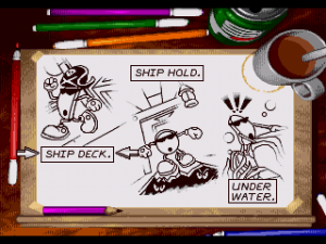 This version still has the Pirate, Horror, and Adventure worlds of the first game, although Sci-Fi’s been cut down to the final stage of the game. Each of the three worlds are made up of about six levels each, and unlike the Genesis version, you have to beat each level in order. You can, however, replay any level you’ve already cleared to look for more secrets. Two of the stages on each world are hidden, and each world ends with a boss stage. There’s also a few bonus stages that go into new genres entirely, like a chase level where Spot has to ride on a tricycle to avoid a T-Rex. Because Jurassic Park was a topical thing at the time, you see.