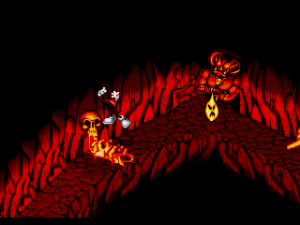 The levels do a good job of looking visually distinct from one another, and each one generally has some sort of unique feature to it. The highlight would have to be a couple of the “dungeon” stages in the horror world. At first glance, it looks like your average creepy platformer dungeon. Pits of acid, spinning balls on chains, nothing out of the ordinary. Then you notice all the nooses, guillotines, and the ambient background noise of women screaming in pain. A smidge dark for a licensed platformer, really. The creepiness is lessened when you find a zombie tied to a rack, which you can fire at to actually stretch him out. While you can’t stretch him out too far, this being a K&A rated game and all, you can use his stretched body as a trampoline, which is darkly hilarious.
