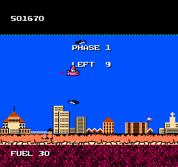 Once you’ve got a basic grasp of survival, and you learn to live with the sixty second fuel limit, things get better, and you’ll perhaps begin to notice some of the game’s more subtle features, or just plain oddities. The game takes your lives easily, but fortunately is also generous with hidden extra lives. You may find an invisible 1up lying in one of the sunken cities’ standout points. Or it may happen that one fellow you weren’t quick enough to rescue will safely reach a raft on the sea level – in that case, picking him up warrants an extra life. And finally there’s that weird sea slug thing – carpet bomb it and you’ll receive the mermaid’s necklace, which not only counts as an 1up, but also has magical powers and can warp the Sqoon in a different dimension, provided that you can reach and destroy the next biofactory without loosing a life. The “other dimension” is shamelessly one of the cheapest special effects you’ll ever find in a NES game: it basically remove completely backgrounds graphics.