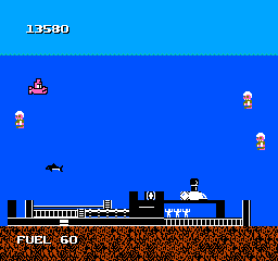 First off, hats off to the man who conceived such a setting for the game. It’s also a bit eerie (and vaguely Bydo-ish?) when you realize that all the cities you see in the backgrounds represent the Earth literally submerged, and that humans (“Man-ham”) are now enslaved underwater-like cattle. The sunken cities you see at the beginning of each phase are pretty much the only background graphics you’ll get. But in exchange for a very monotone seascape, you’ll be pleased by the overall look of in-game animations. The game is littered with tiny sprites, but unlike very early NES games, all of these sprites are charmingly in constant motion. (Don’t be fooled by still thumbnails.) Little sharks and killer whales swim across the screen; crabs and other little crustaceans crawl at the bottom of the sea; your ice bombs leave a frozen geyser; ascend your Sqoon to the surface and its hatch will open. And of course there are those minuscule drowning men, which literally burst out and choke in the water when you destroy the bio-factories they’re imprisoned within. Overall the pixel art and animation in this game is something commendable and will definitely attract you into spending a couple of lives with it. It’s also a good thing that Sqoon can show quite a crowded display without the NES slowdown.