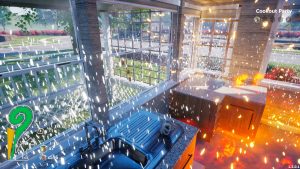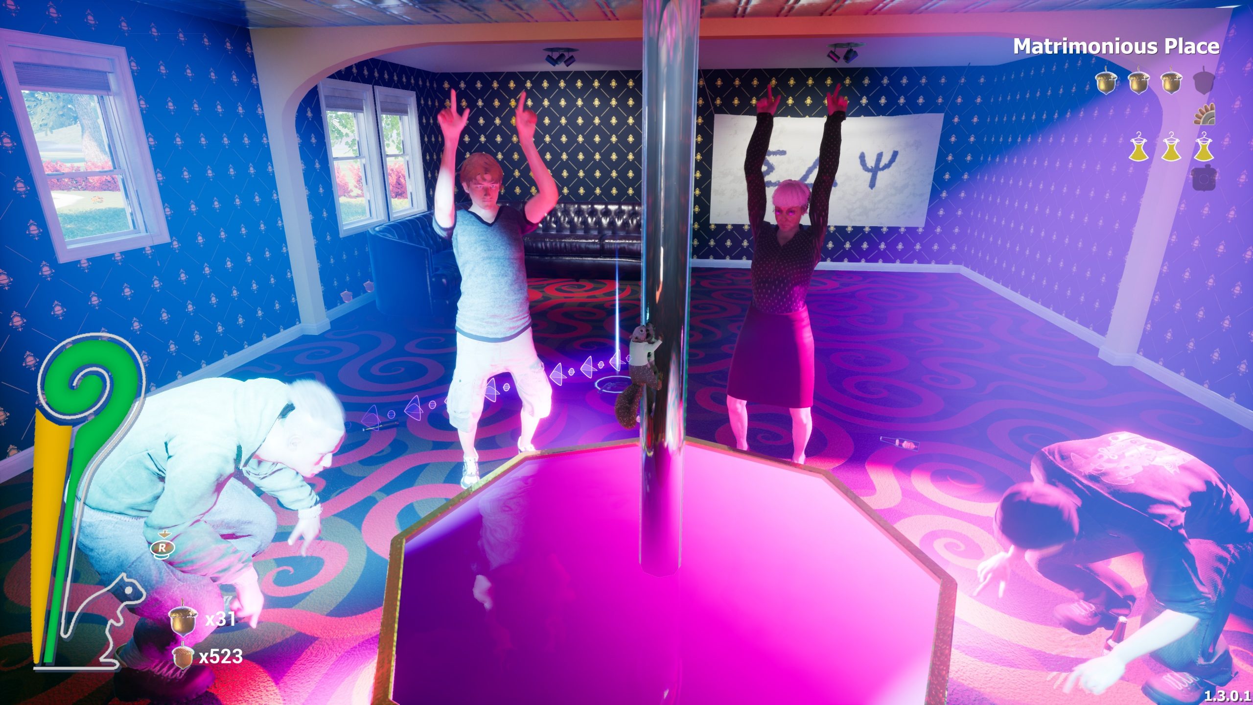 Also on a parental note, there’s no blood or even visible injuries and also no profanity – something even played for humor with giant “HECKFIRE” missiles! There is, however, a sexual joke that might fly over kids’ heads. One house with Greek symbols written on a large sign has people lying on the floor drunk sleeping next to root beer bottles. In the middle of the room is a pole. If you climb the pole, the room erupts in music, lights and celebration. If you climb up and down and around the pole randomly, the people will start throwing acorns at you until you earn the “Pole Party” golden acorn.