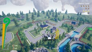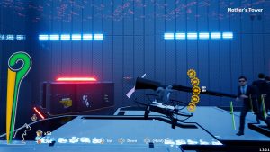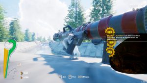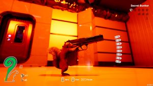 The game’s structure is a combination of linear level-driven, and open world chaos. It begins in a laboratory, with a cutscene that implies that the squirrel might be mistaking some kind of vaguely acorn-shaped experimental product for an actual giant acorn. The opening area is partly a tutorial that teaches the movement, throwing and shooting mechanics, and partly action-oriented gameplay with combat and platforming. You learn how to climb poles, how to knock an agent down to low health and then perform a takedown move, how to use a “slow time” ability that trips agents and makes them drop their guns, and how to fly by shooting – pressing the jump button in mid-air makes you fire your gun downwards, giving you a slight boost that helps you jump over gaps.
