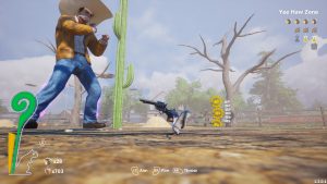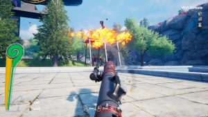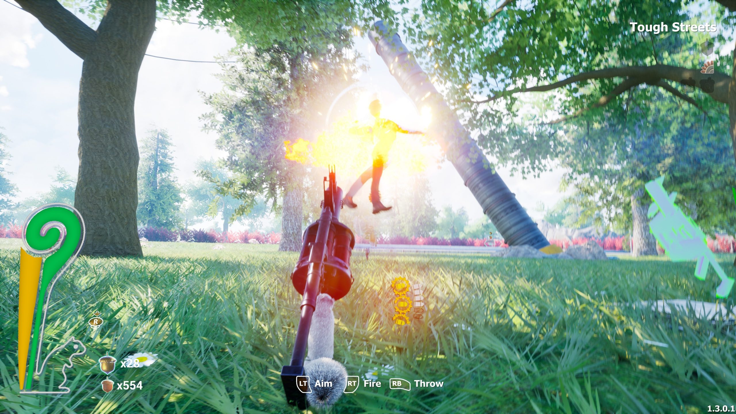 Chaos itself can sometimes help you achieve the goals, but chaos is something you do for fun in between seeking out or stumbling upon goals. If you’ve gotten all the golden acorns for a particular area and you’re seeking out more, might as well trip that jogger – oh wait, that also gives you a golden acorn! Might as well climb this tree, jump on this person and climb their body, get photographed by these people – oh, getting photographed earns you regular acorns, the game’s currency? How about pointing your gun at people – it makes them put their hands up and drop acorns? In this game, experimentation is rewarded, so go wild!