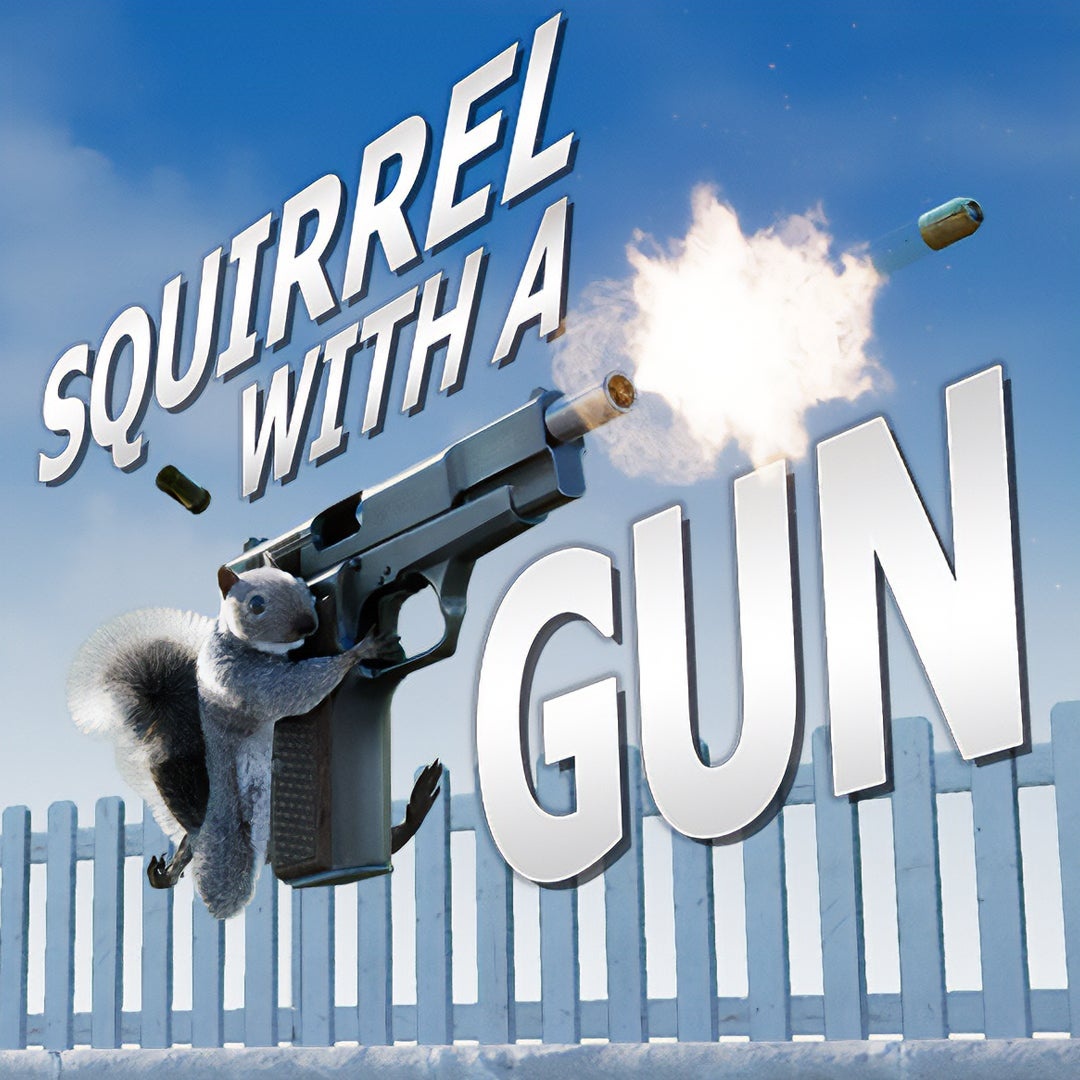 Squirrel with a Gun is a game in which a realistic looking, normal-sized squirrel climbs on people, lets itself get photographed by phone-wielding citizens, throws a brick through a window to enter a locked house, enters the house, finds a bomb in the kitchen and tosses it to cause an explosion that knocks down gun-wielding agents, and steals one of their normal-sized guns, then escapes the house by jumping and shooting the gun downwards in mid-air to get a propelled boost from the shot.