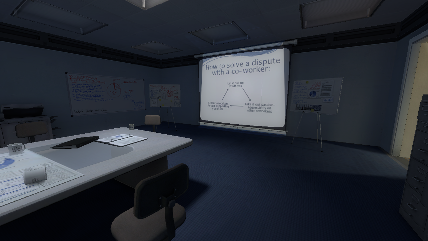 But it’s this choice motif where the game’s most interesting commentary and humor come from. Everything comes back to the concept of choice, something the game has a lot to say on, like how meaningless real life choices are in the grand scheme of things, and how the illusion of choice in a game can be both flaccid and powerful. There are a lot of pointless or minor choices in the game, like locking yourself in a broom closet to annoy the narrator or exploring the boss’ bathroom, but the major ones cause things to branch off in wild, insane directions. However, because every choice you can make in the game has equal meaning in some fashion because of the way the creators wanted the game to be played (exploring those choices), they have far less meaning to the player because those choices are not meant to inflate the ego. There’s even one ending where the narrator mocks you for committing suicide via fall to exert your own power on the scenario, which only leads to a reset. The game wants to highlight just how limiting but enjoyable these sort of fictional decisions are, that they affect how we think and feel, but not really anything in our immediate lives besides distract from the world around us.