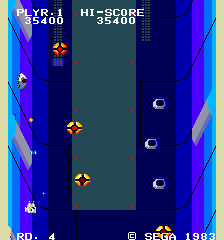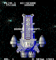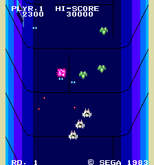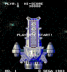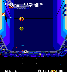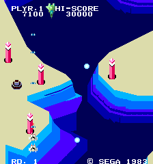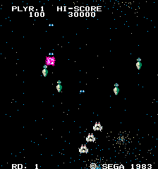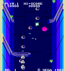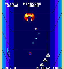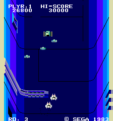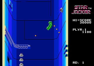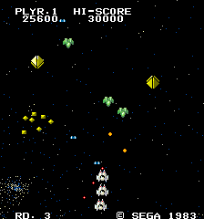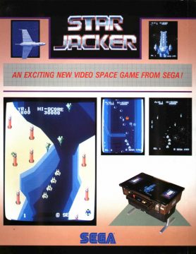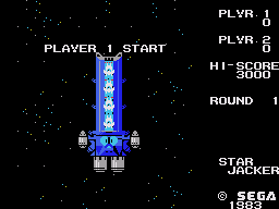Namco’s Xevious was influential to the genre of shoot-em-ups and was instrumental in evolving the genre up from the cornerstone of Space Invaders. If not the first ever vertically scrolling shooter, it was definitely the most popular for its time and broke the notion that shooters had to take place on one controlled screen all the time, with the action scrolling over forests and plains and seas and other terrain while throwing aerial and ground-based enemies at you. Every other vertical shooter to be made after 1982 owes their existence to Xevious, although the genre would certainly evolve in directions that Namco wouldn’t have forseen. Take Star Jacker for example, an unassuming early Sega shooter that may not be the most exciting or outlandish shmup of all time, but it’s a solid product that takes the basic premise of Xevious and adds its own twist to the formula.