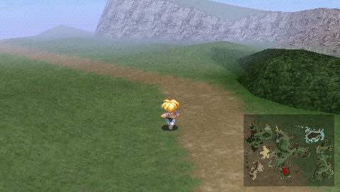 Some of the prerendered backgrounds, the ones that scroll horizontally, were made to fit naturally into the PSP’s widescreen view. Others had to be stretched out in order to fit the whole screen. The overall quality is mixed, but generally you can’t tell anything looks too out of whack unless you directly compare them to their originals. The sprites are identical but look a little blurrier, to mask the pixellation. The battle backgrounds have been changed a bit, and make the transition to widescreen smoother since they weren’t prerendered to begin with. They look cleaner, though some of the obstacles, like the falling boulders, have been removed. The world map has also been completely redesigned with cleaner textures, though it has a lower draw distance and more fog. The voice quality is improved, but the music sounds a little worse, since it’s missing the reverb of its PS1 counterpart.