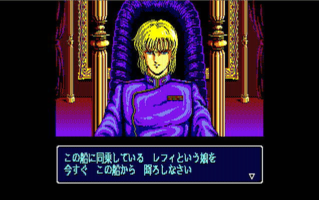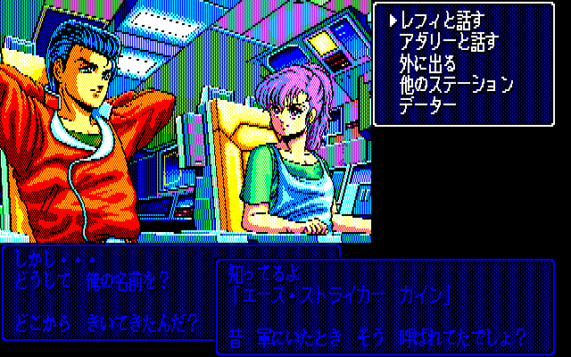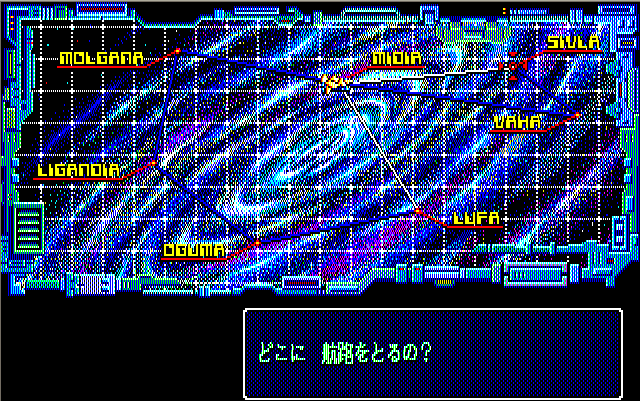 Initially released on the PC88, Star Trader combines elements of an adventure game with shoot-em-up segments. As ace pilot Kain, you’re approached by a young girl named Lefi, who has some kind of mysterious seal. I’m lost about the rest of the plot, but it’s your job to fly around the star system and uncover whatever mysteries need to be solved. As you reach new space stations, you’re granted more money, which in turn can be used to buy new weapons for your ship.