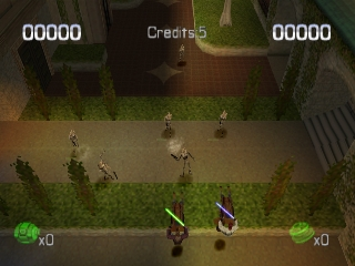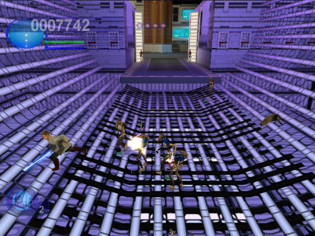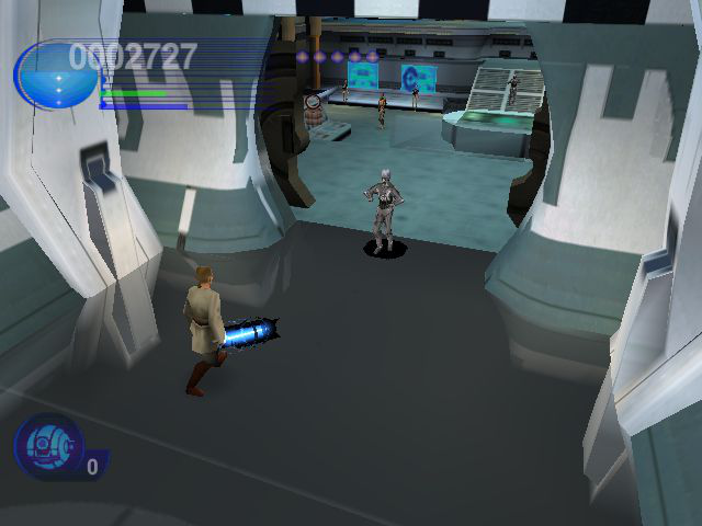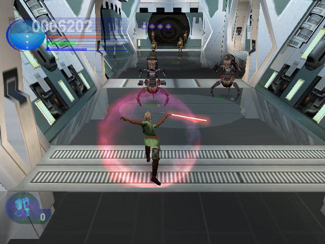 After choosing his favorite Jedi among the ones available (Adi Gallia, Mace Windu, Obi-Wan Kenobi, Qui-Gon Jinn, Plo Koon for the first two version or Obi-Wan, Qui-Gon, Mace Windu for the handheld one) the player starts with a first impact of the game on the Trade Federation Battleship, ideally following the plot of the movie. He is welcomed by a barrage of blaster shots by many Trade Federation Droids (which you can fight alongside a friend, thanks to the co-op mode), leading the player to quickly learn how to deflect them with the lightsaber and how to properly do the available double-jump in order to progress through the many not-always properly designed platforming areas, while picking-up power-ups whose sound design clearly resembles the laugh of a famous 900 years old Jedi Master (and these are Health, Force, your “bomb” item, Blade Amplifier, Blade Extender, Checkpoint, Point Bonus, Extra Life, Challenge, Randomizer, Ultimate Power-Up and Gungan Artifact).