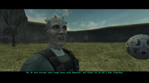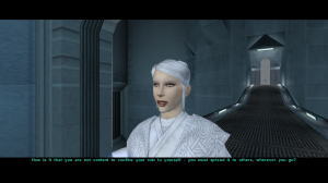 Kreia – The exile’s new master, a mysterious woman who seems to have a past with both jedi and sith. It’s clear she has an agenda, but since she hates every faction, it’s hard to say what that agenda is. What is for sure is that she hates it when the exile is acting saintly or like a serial killer, but she does approve of acts of manipulation. She’s always neutral and can use any force power with no penalty.