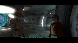 HK-47 – The assassin droid from the last game, now collected as a shell in the Ebon Hawk’s storage closet. You can repair him by finding his missing parts and recruit him, where he will mock the melodrama from the last game, suggest new ways to murder, and plan a way to hunt down a sudden influx of poor copies of himself spread around the galaxy.