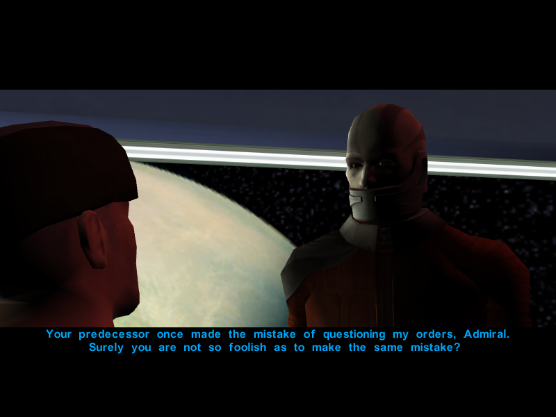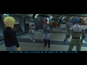 KOTOR‘s story has all of the usual Bioware strengths and weaknesses. The characters are fairly likable, despite how poor many of their introductions are, but the main story created for them is fairly weak. KOTOR, despite being set so far in the past and offering more fantasy-like elements instead of the usual sci-fi focus, has the exact same sort of conflict as the original trilogy. The aforementioned artifact of doom being used has the Sith effectively putting the Republic in similar shoes as the rebels, despite the Sith being an invading force and not a ruling one. They even have the exact same command set up as the Empire from the original trilogy, and you’re first introduced to their foot soldiers during a fascist occupation. Malak, the main antagonist, comes off as an angrier Darth Vader, and far less threatening. He’s like a rejected Mad Max villain, complete with a goofy fake jaw and weird blue paint put over his bald dome. The Sith are generic “MUHAHA, YES, I, AM EVIL, MAHAHA” style bad guys, a mixture of kneeling fascist bullies and idiot force users who fail to see the woefully large cracks in their own ideology, and the story doesn’t put enough attention on this fact to make it work in a critical sense outside the Korriban trip.