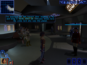 On the light side (*ba dum tis*) is the character writing. Bioware has always had a knack at making likable characters, even within archetypes, and this game is no exception. Carth seems like a boring dude, but once his paranoid side starts coming up, he becomes one of the most relatable members of the cast. Mission and Canderous are just fun to have around for different reasons, Juhani has a strong arc, and Jolee is genuinely one of the best party members the team has ever made (and that is not said lightly). Bastlia, T3 and Zaalbar are the weak links, but even they get some moments of note. Of course, the stand out remains HK-47, though it’s not until the second game that he really comes into his own. It’s just refreshing to have someone so openly evil around, making him a much needed source of dark comedy for light players.