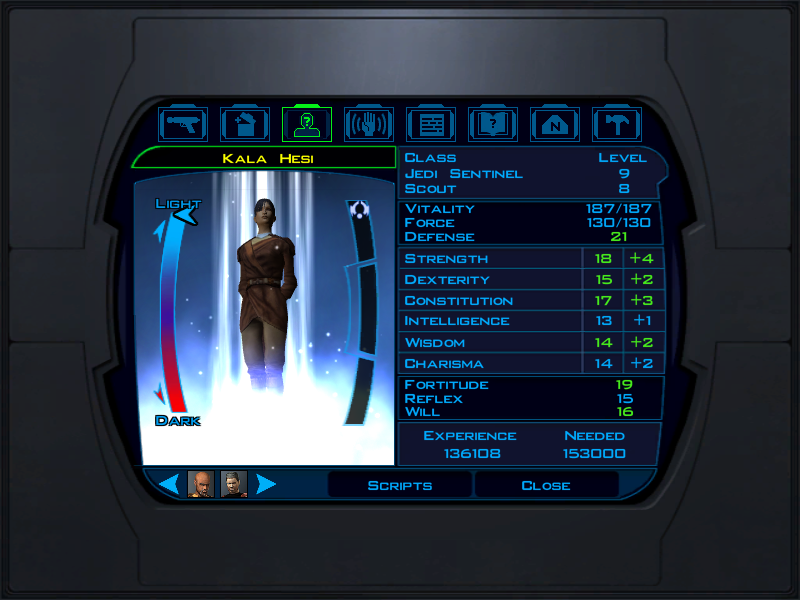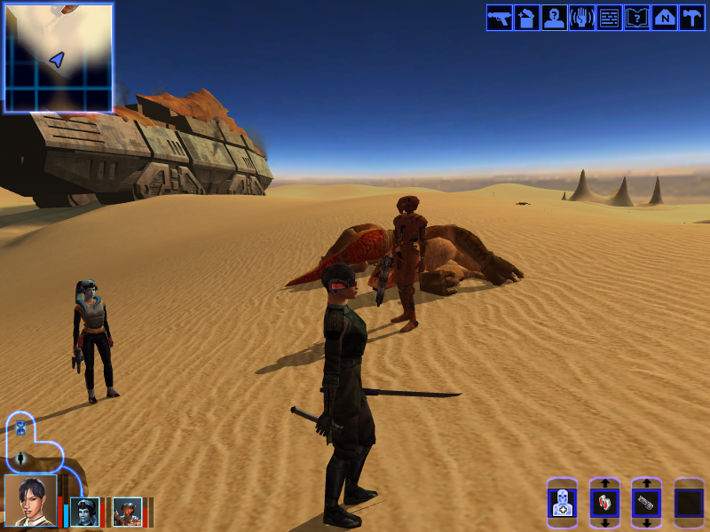 Canderous – One of the two dark aligned party members. A former Mandalorian soldier and veteran of the Mandalorian War, the war that caused Revan to turn to the dark side. He’s good at melee and distance combat, joining when he decides to ditch his obnoxious crime lord employer.
