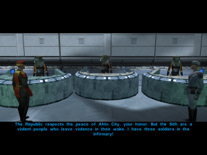 Quests are mostly a mixed bag, ranging from kind of inventive (including a criminal investigation and a surprisingly fun racing game) to oddly empty. The main four world quests to go through in the story are mostly poor. Kashyyk is just unsatisfying in its conclusion, no matter what side of the force you side with. Tantooine’s feels underdeveloped, though partly because of the lack of sights to see. Manaan has some good side quests, but the story quest comes down to some forgettable base crawls. Korriban is the only one that stands out, with some fun bits at a sith academy and the only point of the game where it properly criticizes some of the politics on display by deconstructing the sith code. The most disappointing aspect of all of them, though, is that most everything comes down to the limiting light and dark morality system. You’re either a cartoonish serial killer or a goodie two-shoes with weird moral lapses (see not killing slavers). There’s no real middle ground, and the game seems to actively want you to pick one extreme or another. Unfortunately, this is a problem we still have with moral choice systems to this day, kind of defeating the role playing aspect of the role playing game by pigeon-holding things into two bizarre, inhuman extremes.