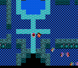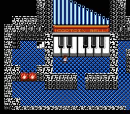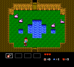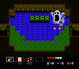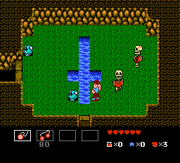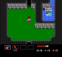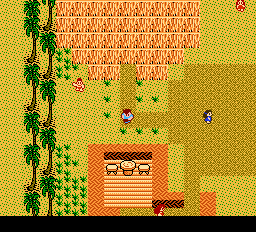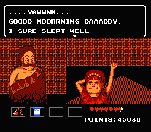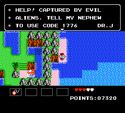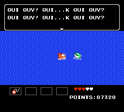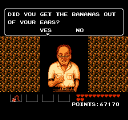 The overworld area is fairly open, though it borrows from Dragon Warrior with the secret areas to push up against, often revealing passages and hidden items like Heart Containers. There are a few puzzles here, including a rather annoying maze, a music puzzle, and to the frustration of all those who didn’t get the game in box and complete, a fairly innovative puzzle which requires the player to dip a letter received with the instruction manual into water, to reveal a hidden frequency needed to complete the game. (It’s 747.) Most of the story is pretty cut and dry, but there are enough amusing sequences to keep it interesting, like having to go in drag to infiltrate Shecola Castle. There’s also a strange running gag about getting bananas stuck in your ears.