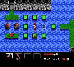 Unfortunately, the controls are a bit awkward, which tends to turn people off StarTropics. The movement works on a grid system, it’s not possible to just move a few pixels, and Mike always has to move over a whole square. Furthermore, in order to walk in a direction, it has to be held down for a split second before Mike actually moves. Unless he’s next to water, he can only jump straight up. And the only way to move from tile to tile is to jump, which can take a long time if there are plenty of tiles in the room. Even compared to the original Legend of Zelda from 1986, the movement feels restrictive and can get frustrating when the rooms are filled with enemies.