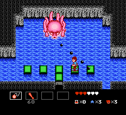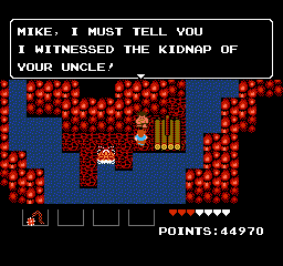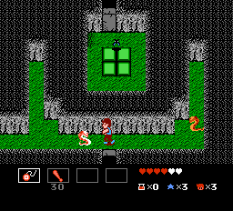 The underworld requires mike to move along X-Y axes like in The Legend of Zelda. The primary weapon is a Yo-Yo (kind of like Mikey Walsh in Goonies II) that later powers up into a Morning Star and a Super Nova, each with extended power and range. The power-ups are dependant on the progress in the game, as well as the number of hearts Mike currently has (if it slips below the required number, the weapon downgrades). Mike can also use other sundry weapons, ranging from bolas, room-freezing snowmen, baseballs, and even lasers, though each of them has a limited number of uses. Also needed are special crystals which reveal hidden enemies, and lamps to light up dark rooms. Medicine is also found along the way, restoring five hearts. Defeated enemies occasionally drop hearts and stars (five stars replenish one heart).