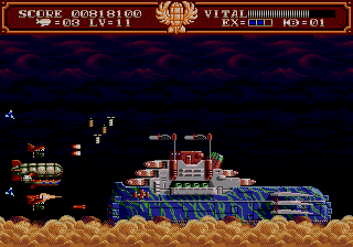 Steel Empire, developed by Hot-B, was one of the titles to break away from these themes, instead taking place in a steampunk setting. The world design is inspired by the works of Jules Verne, as well as classic anime like Mirai Shounen Conan. Most flying vessels are either biplanes or dirigibles; many enemies are steam-powered trains. In the year 18XX, most of the world is dominated by an empire called the Motorheads. The only free nation left is the Republic of Silverhead, who sends a lone pilot to destroy the Motorhead forces. The menu screens present the story as if it were a displayed via an old projector, with flickering, sepia toned images. The ending take the scenario a few steps further, by listing fake credits as if it were a movie, based on a non-existent book by a non-existent author, purportedly written in the early 19th century. It does get a little bizarre by the final stage, which sends the ships into outer space, with the final battle being fought on the surface of the moon.