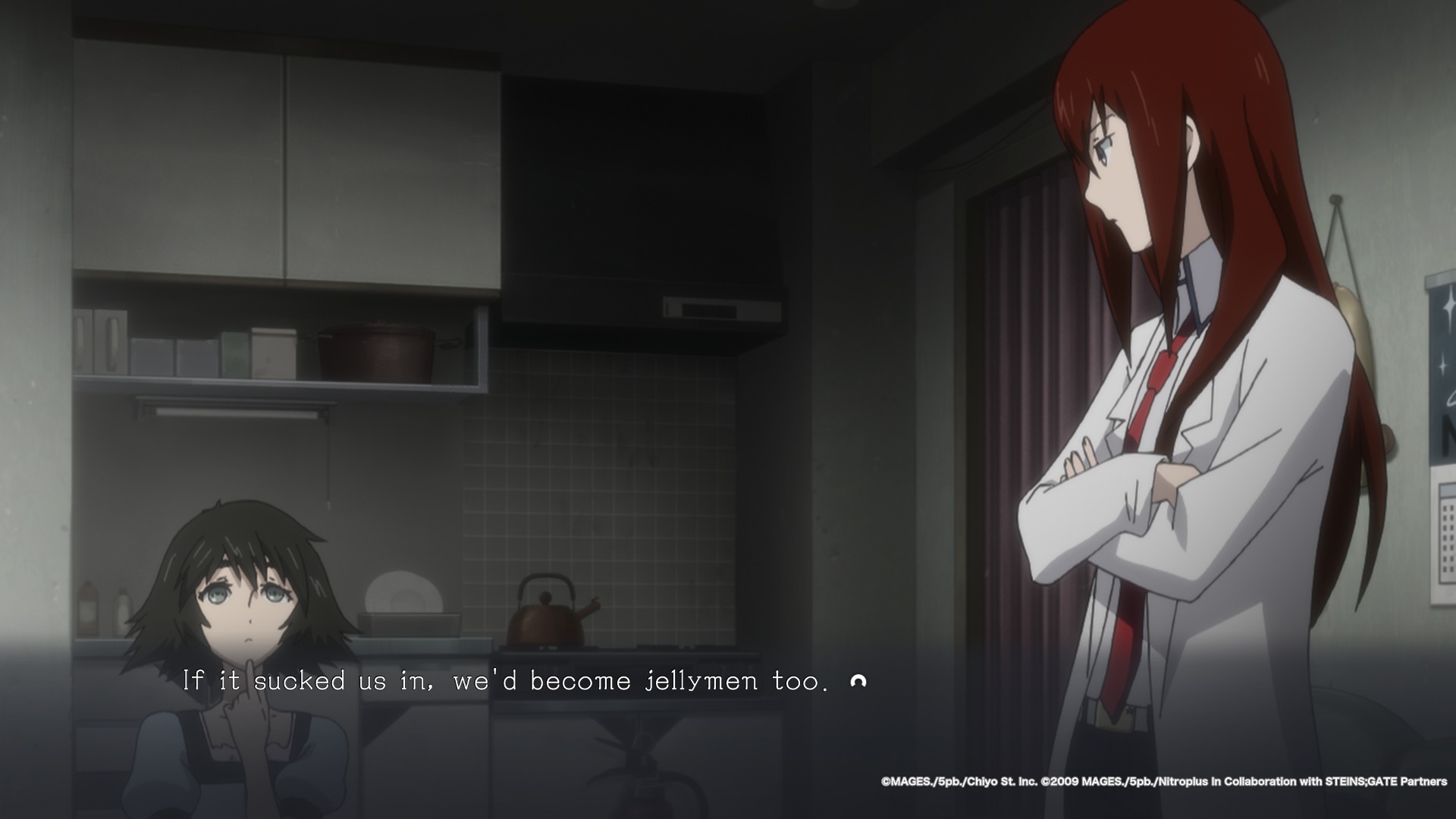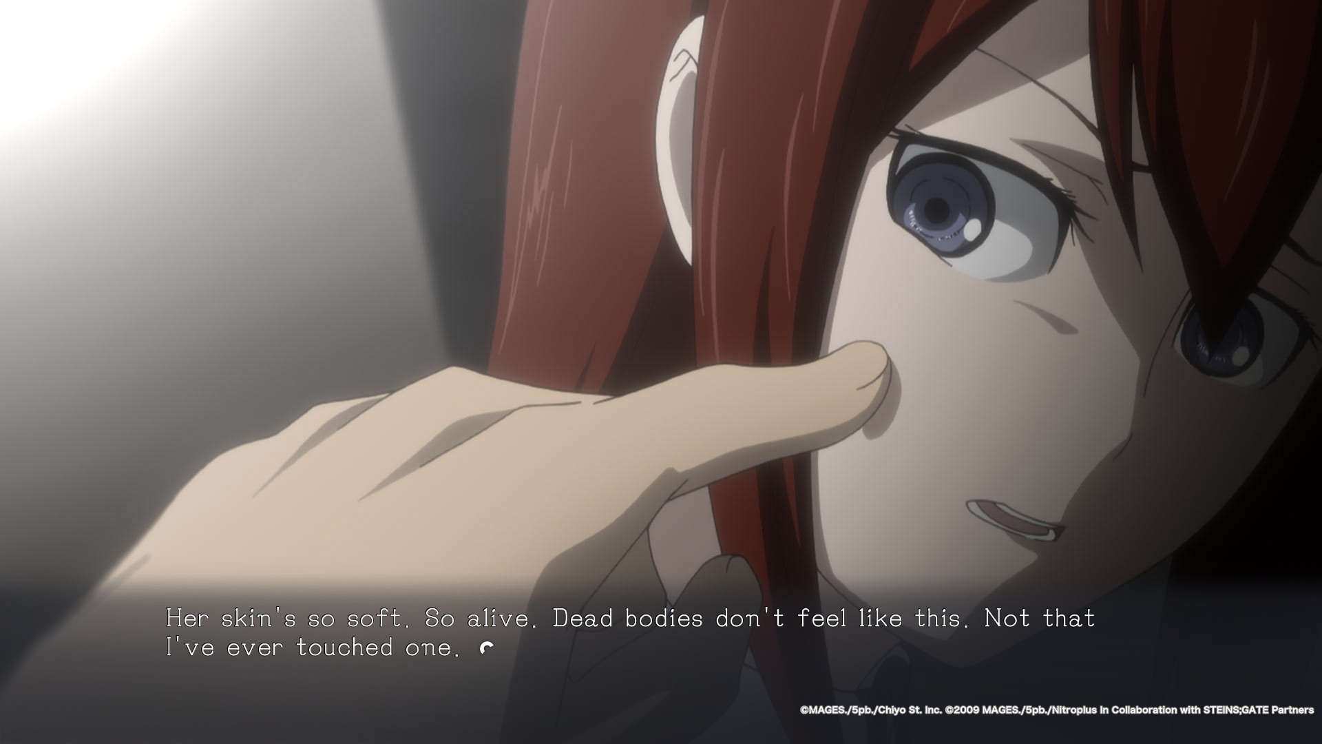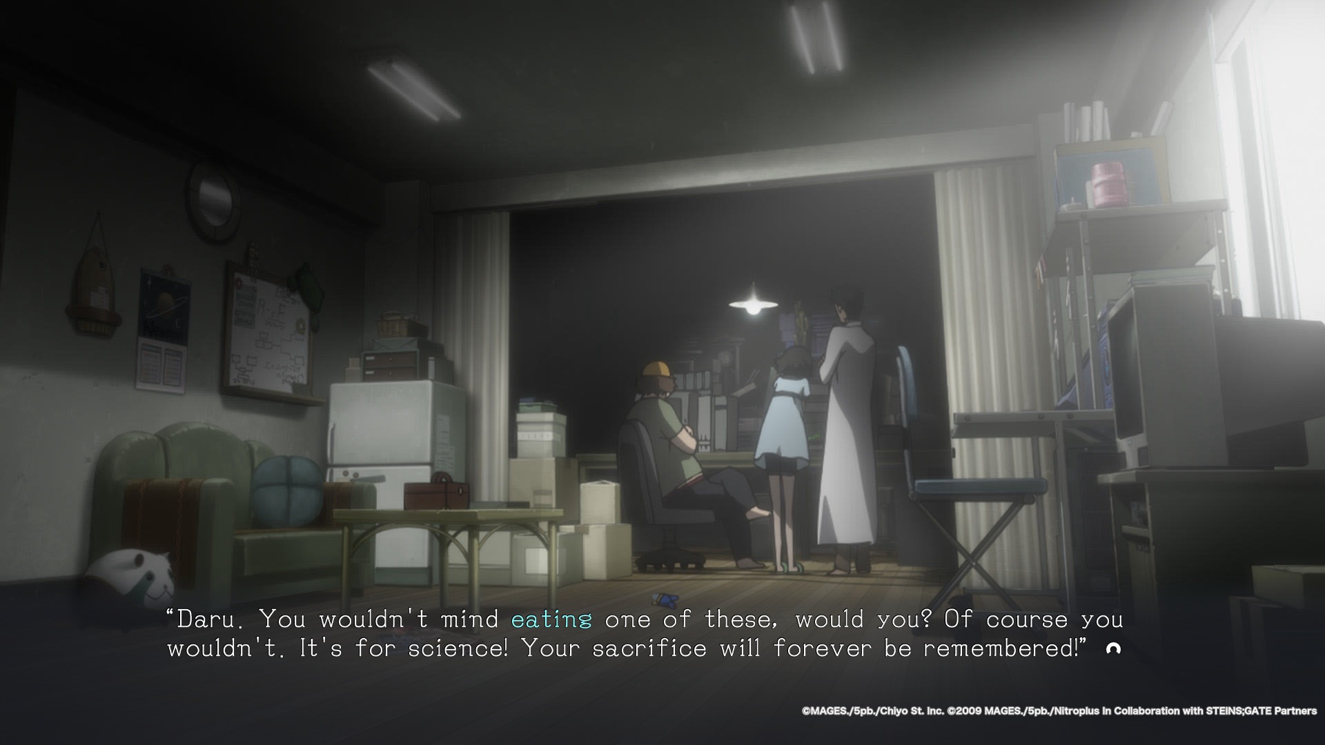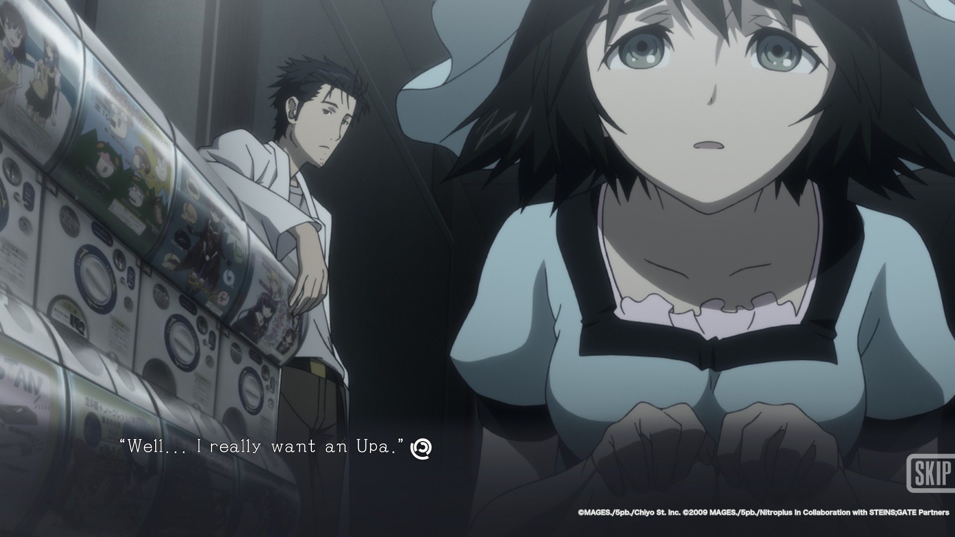 This comes with both its positives and negatives. Visual novels aren’t exactly the most elaborate games, graphically speaking, so presenting everything in animated form makes it much more dynamic and engaging. It also uniquely benefits the story of Steins;Gate itself – protagonist Rintaro Okabe is such an oddball, rambling about conspiracies and imagining himself as a mad scientist, that presenting the story from his perspective was always kinda off-putting, at least in the initial hours. Since the text really hasn’t changed, it’s still written from the first person perspective, but actually seeing Okabe act and react to the world around him helps the character make more sense, so he’s a little less abrasive. (This was also a plus of the anime, too, of course.) On the downside, the art, despite being animated, just isn’t nearly as crisp or distinctive. The adapted art of the anime is excellent, but they lack the characteristic designs and shading of Huke’s illustrations, and it feels like something is missing.
