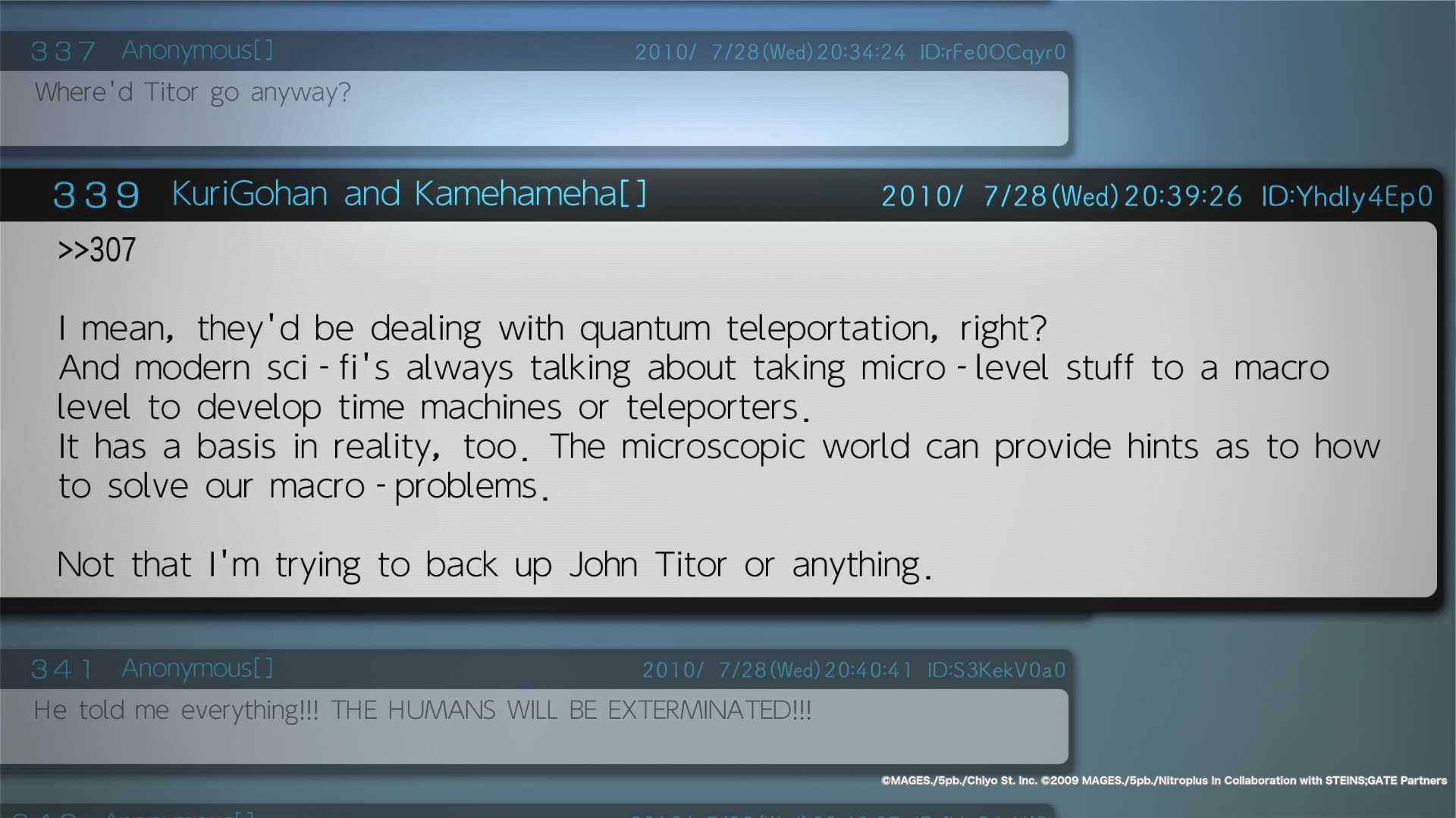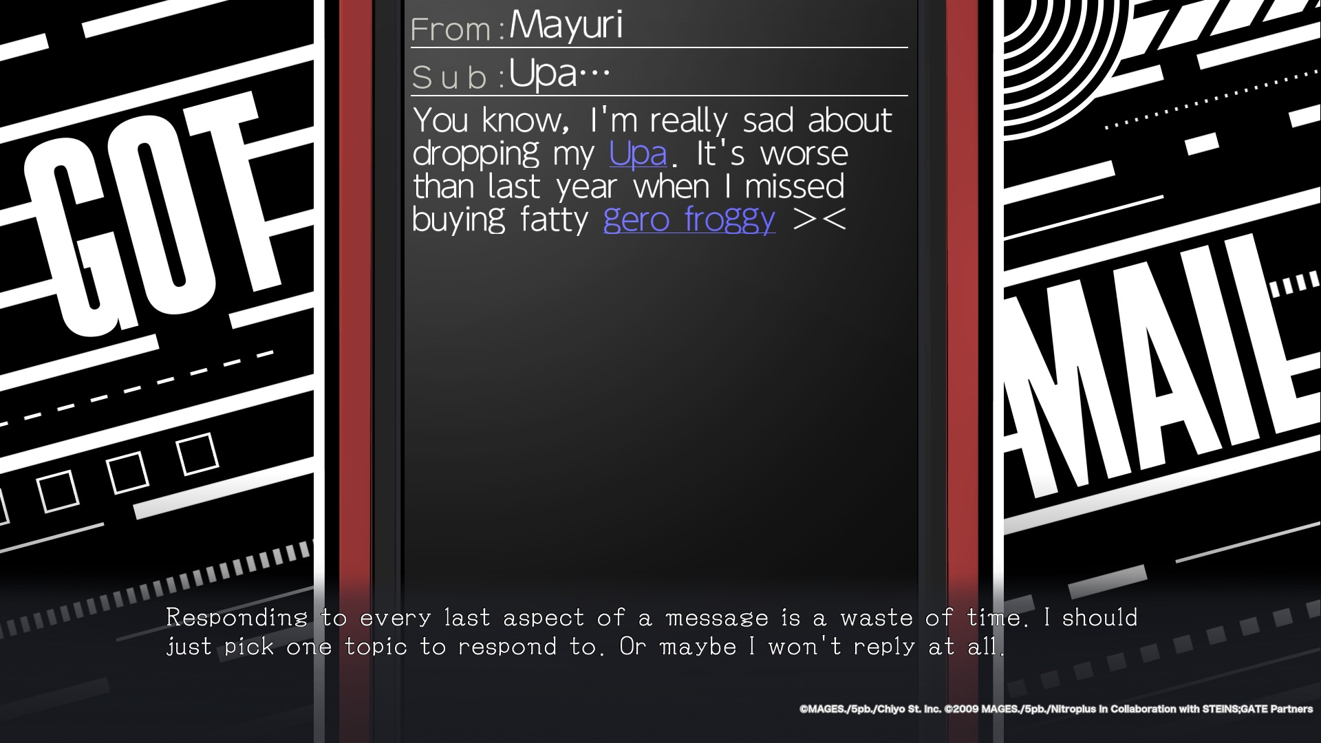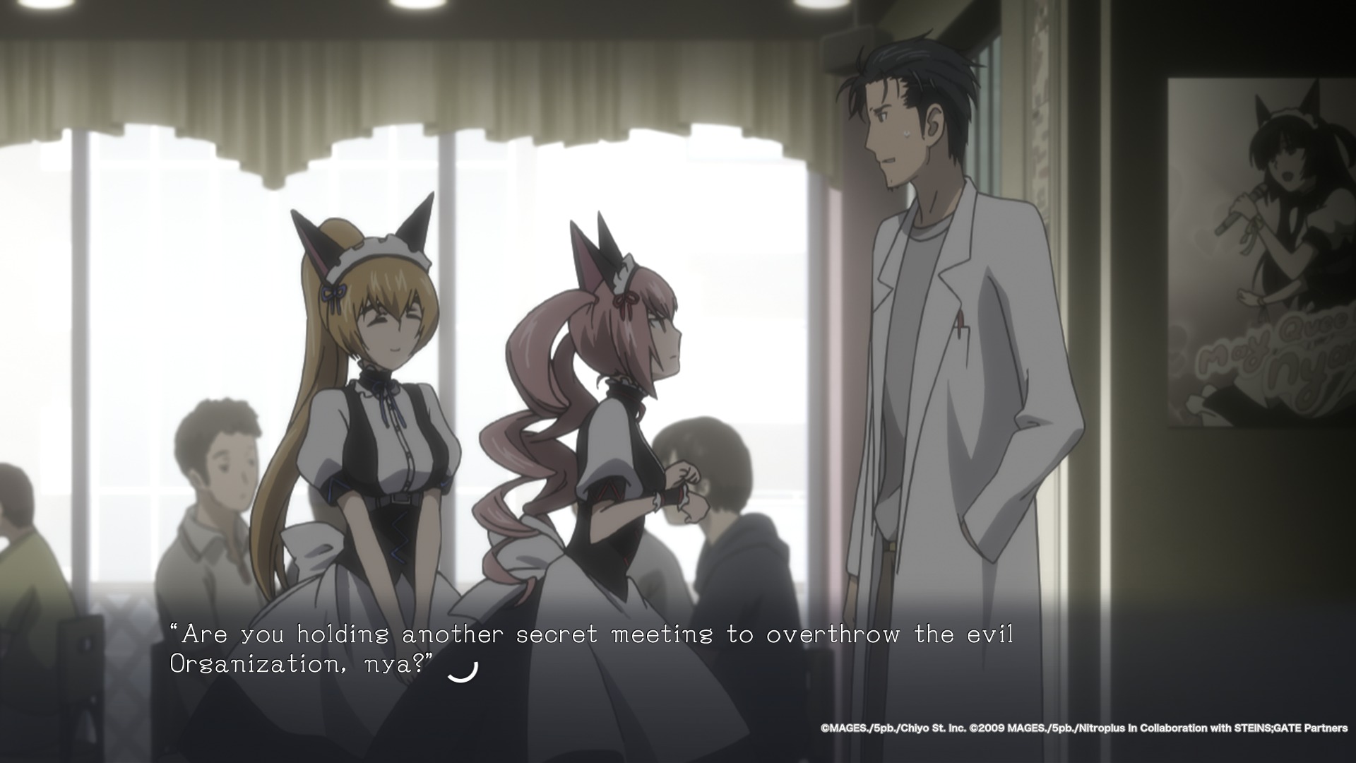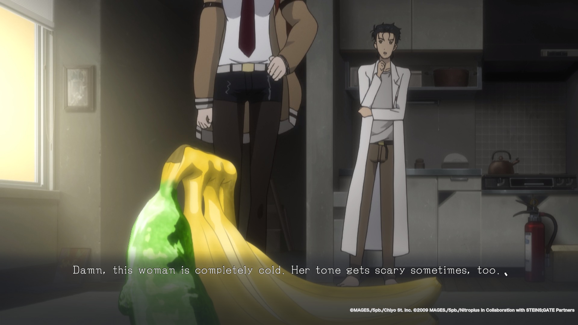 This comes with both its positives and negatives. Visual novels aren’t exactly the most elaborate games, graphically speaking, so presenting everything in animated form makes it much more dynamic and engaging. It also uniquely benefits the story of Steins;Gate itself – protagonist Rintaro Okabe is such an oddball, rambling about conspiracies and imagining himself as a mad scientist, that presenting the story from his perspective was always kinda off-putting, at least in the initial hours. Since the text really hasn’t changed, it’s still written from the first person perspective, but actually seeing Okabe act and react to the world around him helps the character make more sense, so he’s a little less abrasive. (This was also a plus of the anime, too, of course.) On the downside, the art, despite being animated, just isn’t nearly as crisp or distinctive. The adapted art of the anime is excellent, but they lack the characteristic designs and shading of Huke’s illustrations, and it feels like something is missing.