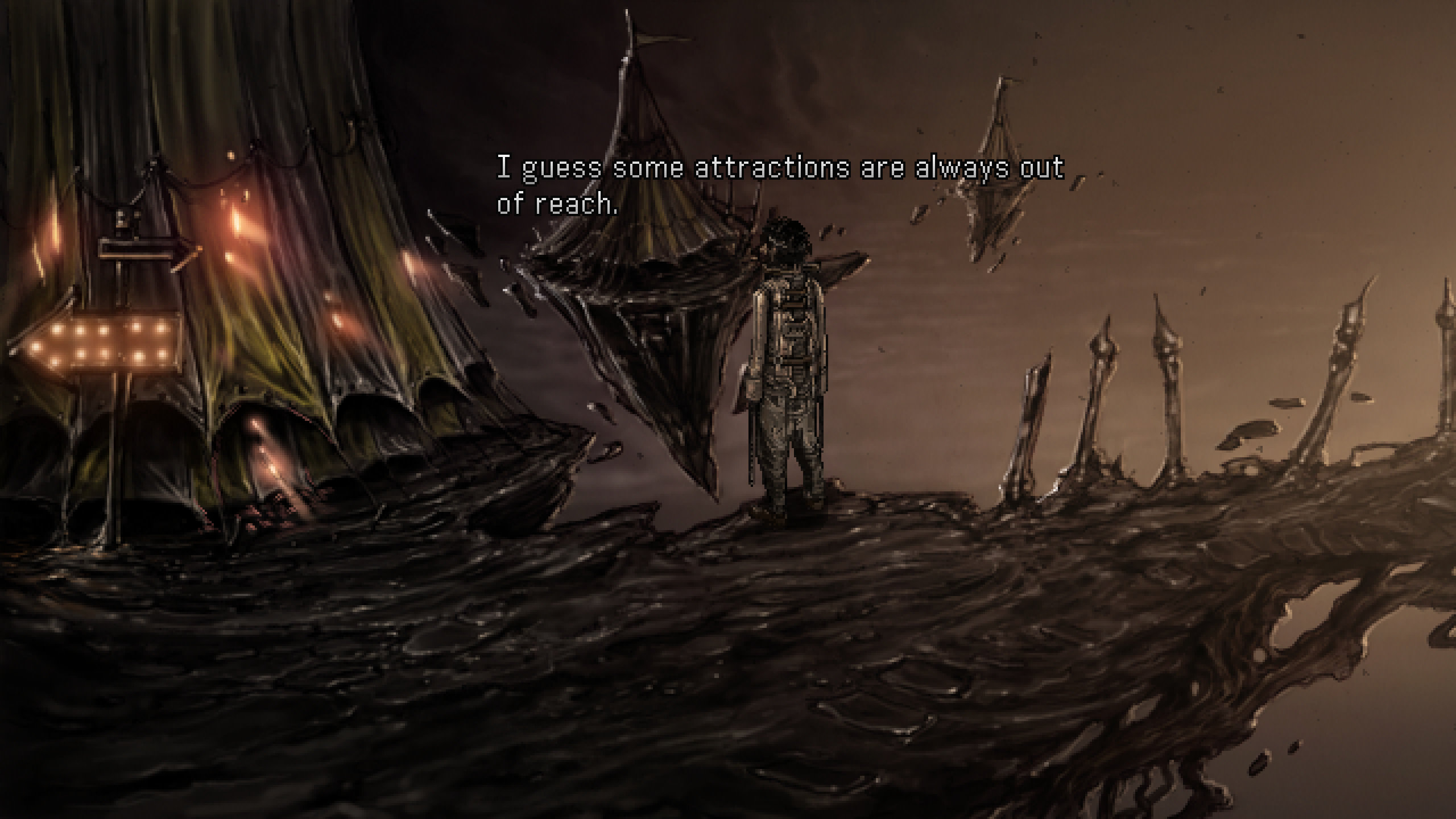 The narrative at play is extremely based in imagery and symbolism. You control the Stranger, a man who can’t remember anything, trapped in a strange carnival. In reality (or as close to reality as this game gets), what we’re experiencing seems to be a sort of mind world, plainly spoken later but pretty obvious from just listening to a few bits of dialog early on. What this world actually is never gets explained, but we don’t really need to know that. We only need to learn more about the Stranger through it, following along his quest and trying to find meaning, while having an antagonistic force in the form of a shadow creature called the Dark Thing that starts creating havoc and death later.