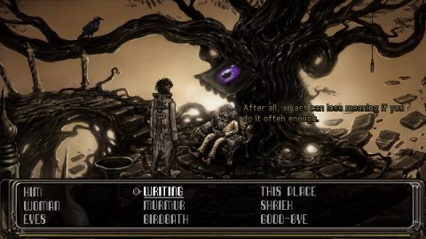 While nothing concrete is ever given, there are enough hints in the symbols used to start forming a picture, some symbols so blunt that the implications are just saying it without words. There’s a noose in a tree. The Stranger approaches some dangerous situations, like using the knife item on yourself, as “a way out.” There’s a black dog you have to deal with, a common symbol of depression, and the Dark Thing causes the Stranger to freeze up when it appears to destroy something.