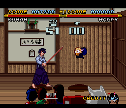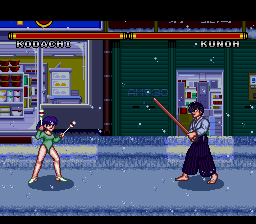 Chōnai Gekitōhen is modeled on the Street Fighter II template but deviates from it in several ways, especially in its control scheme. Jumping is performed by tapping X. You have two buttons for normal attacks: Y and B. A special attack is assigned to A. Blocking is performed by holding L or R, like in Mortal Kombat. Combos are essentially irrelevant, and you can change characters between fights. The controls are as responsive as they need to be and its game physics are decent, but do not allow for the ease of control and perfect responsiveness necessary for a Street Fighter II clone that wants to be taken seriously. There are special moves, but they are performed with rather simple commands, ala Super Smash Bros., rather than quarter circles or whatever. Besides iffy control responsiveness, hit detection could be better and it’s basic fighting system is simply not very well designed.