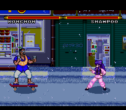 Chōnai Gekitōhen‘s presentation does little to redeem the title. The game is ugly, even by the standards of 16-bit Street Fighter II clones. The backgrounds, character designs, and animation details look poor, and music the and sound effects are lacking.