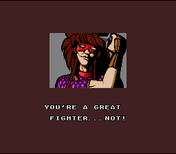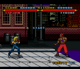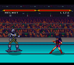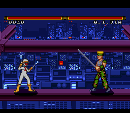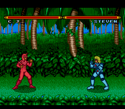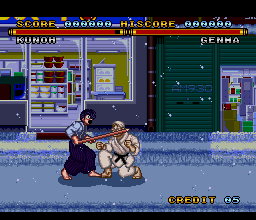 The game was localized in America by Irem with some major cosmetic changes. Since Chōnai Gekitōhen‘s release came several years before anime and manga hit the American mainstream, Irem probably felt releasing such a goofy and heavily Japanese (for lack of a better word) game might be a risky venture. The title was changed to Street Combat, the cast was swapped with a bunch of World Heroes and Street Fighter 2010 rejects, and the plot was given a total overhaul. Male Ranma was turned into a blond-haired dude named Steven who fought in a robotic suit, while Female Ranma was turned into an armorless version of Steven. The rest of the Ranma cast received similarly bizarre makeovers – Genma turned into a black guy with sunglasses and pink hair named Tyrone. Kodachi is now a clone named Dozo, while the kendo sword wielding Kuno is now a hilariously generic army dude (also wielding a sword?) named G.I. Jim. Konchon was turned into a skateboarding robot name Helmut, while Shampoo received the most transparent makeover by dying her hair and turning herself into a masked wrestler. Ryoga is now a wiener in a red suit named C. J. It’s exactly the same game as Chōnai Gekitōhen, except totally embarrassing.