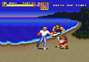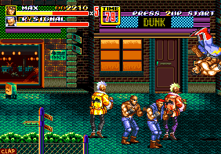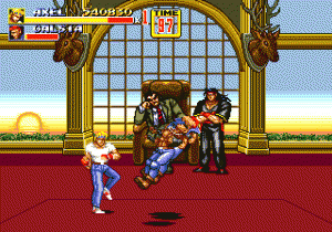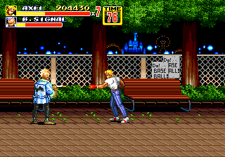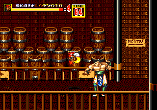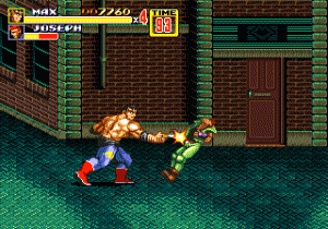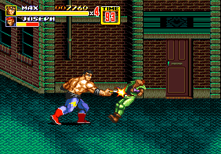 The graphics have undergone a major improvement, with every character sprite now just as large, if not more so, than the boss characters of the original game. The extra level of polish is easy to see in the levels, as well, with an assortment of impressive graphical effects. The pirate ride on Stage 3 makes use of rudimentary background rotation, while the waters under the bridge on Stage 2 reflect the city skyline in the background. The music is even better now, and just about every track is instantly memorable. The sound effects are also a lot crisper, with plenty of meaty sounds as blows impact foes, and lots of digitized speech that adds just a little more impact to each move.