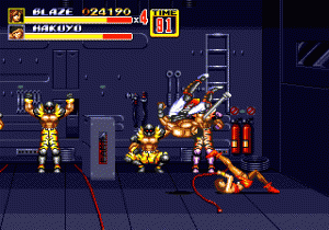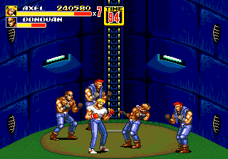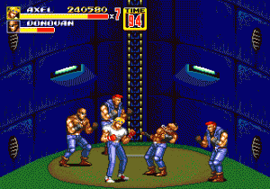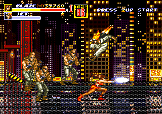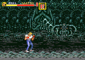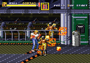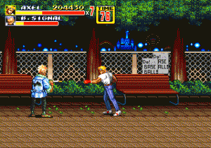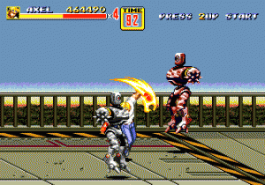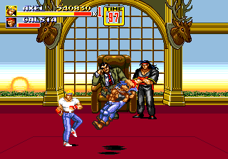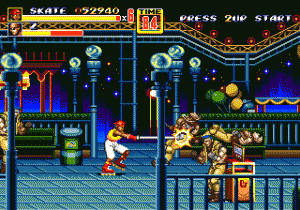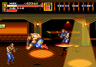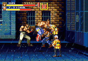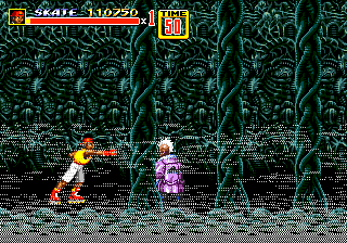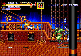 One year after the events of the first game, Mr. X has, as the introductory cutscene phrases it, “come back to life”. It could be that they meant this metaphorically, like a new guy took his place, or maybe they actually mean that he ended up just magically being resurrected, like Castlevania’s Dracula. Who knows. In either case, Mr. X sends out a new wave of minions onto the city. He’s also captured Adam in an attempt to lead Axel and Blaze into a trap. This time, however, is that they’re joined by Max Thunder, Axel’s pro wrestler friend, and Skate, Adam’s kid brother. Yes, the good guys have no qualms about sending a young child out to fight The Syndicate with little more than his bare hands and a pair of roller skates. In all fairness, however, he can kick as much ass as the grown ups, and the idea of a preteen taking a katana to a small country’s worth of gangsters is a little hilarious.