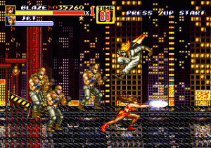 The entire game feels far faster and snappier overall, which makes everything feel immensly more satisfying. The game is fast enough that you can attack with a jumping jab attack to hold an enemy in place, launch into your basic combo, and then finish it off with your forward special move to unload incredible damage onto your foe. It’s not quite as advanced as such combo-heavy games as Alien VS Predator, but it makes for a game that feels even smoother to play than some of the best of its competition. Perhaps the only real flaw in the game’s combat are the handful of especially annoying bosses. Jet’s one great example — a guy in a jetpack who often ends up slipping out of your combo, where he can counterattack you easily.