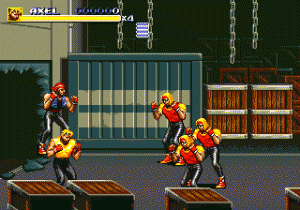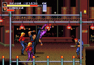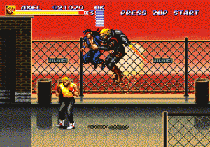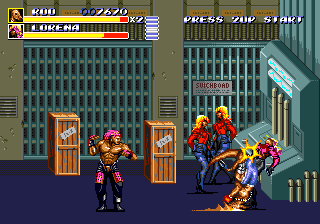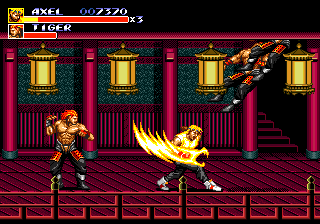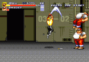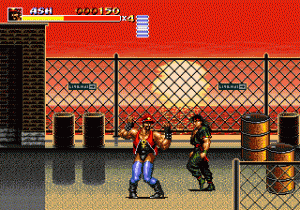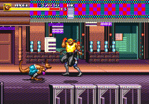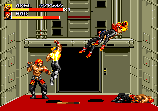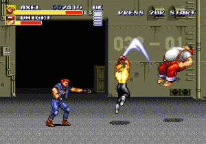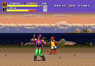 There’s an assortment of other, smaller differences. The main characters wear different colors for unknown reasons, women enemies wear less revealing clothing, and certain voice clips have been re-recorded. Most major of all is a character who was removed from the Western version entirely. Ash is the typical ‘hard gay’ Japanese stereotype, who prances around in leather wear, giggles like a girl, and poses constantly. He’s unlockable after being faced as a miniboss, and despite his limited moveset, he’s surprisingly powerful. Given just how uncomfortable he is, however, his exclusion from Streets of Rage 3 is hardly a fault.