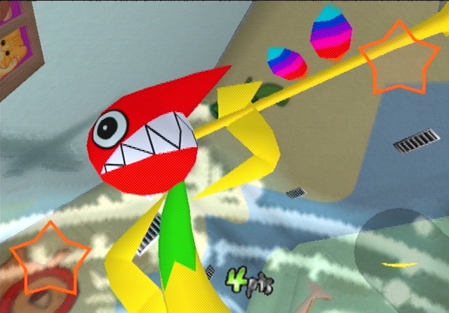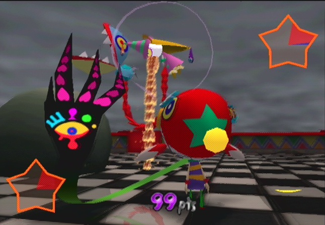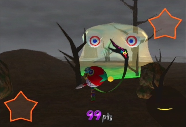 Stretch Panic isn’t exactly technically accomplished – the low polygon models and sparse environments are typical of early PlayStation 2 games – but it isn’t all bad. The art style is nothing but unique, showcasing a variety of imaginative creatures that occasionally venture into the cutely disturbing. Some of the stages are a bit on the dark side, but the brighter stages are appropriately psychedelic. Even though it sorely lacks Treasure’s tight and simple game mechanics, it does exude much of the same wacky charm. The music, however, ranges from forgettable to irritating.