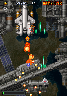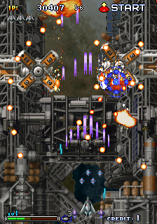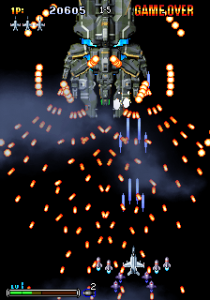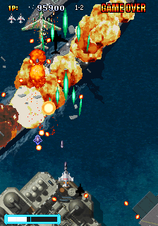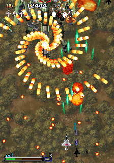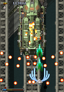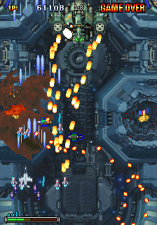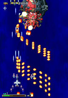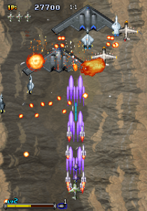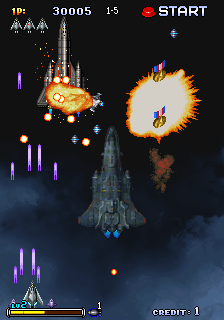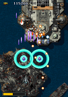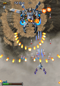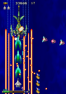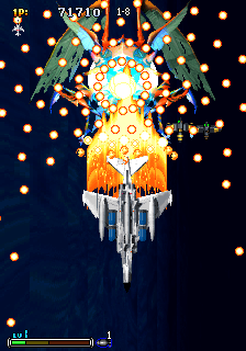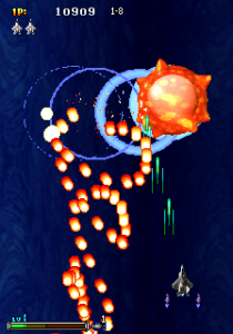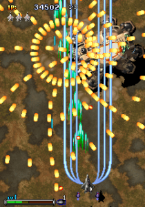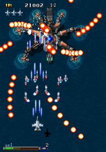 There are two new scoring tricks in this entry. All bosses have an extra powerful super attack. Whenever a boss uses a super attack, a blue orb is shown, which is its weak spot. Shooting the blue orb not only does extra damage, but it awards bonus points. It’s a pretty cool feature and very well implemented. The other replaces the gold bars for medals and introduces medal chaining. Picking up a medal while it is spinning starts the chain by giving you 2000 points, and continued by adding 2200 points. Chains are broken when you die or collect a medal worth below 2000 points.