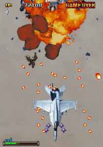 Strikers 1945 III, also called Strikers 1999, is a dramatic change from the last two games, ditching the World War II feel for a modern war setting. Giant robots and super science are still all around, but it doesn’t look as out of place in 1999, giving the game a look similar to Raiden Fighters or Air Gallet more than anything.