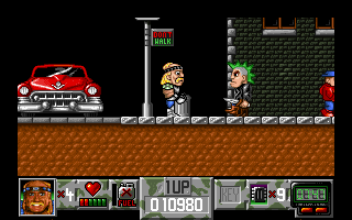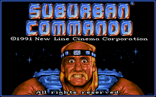 Like many other video games based on films, Suburban Commando is only vaguely related to the original motion picture. Given that Shep is an interstellar traveler, the first stage is a simple horizontal shooter leading to Suitor’s spaceship; the other stages are platforming (since almost every other licensed game of the period was a platform game) followed by one-on-one boss fights (since you can’t do a game with the Hulkster and do away with the fights). One stage is set on the aforementioned spaceship, and the remaining others on Earth, but the locations don’t really resemble the ones in the film, and Wilcox with his family are nowhere to be seen, not even in cutscenes because this game has none of them. Unless he’s that lanky guy apparently humping a trash can in level 3.