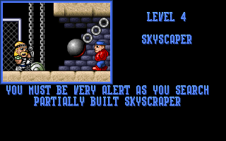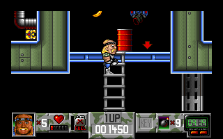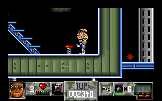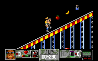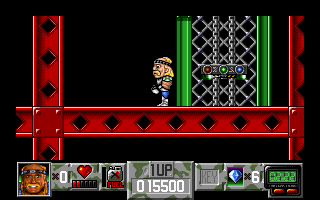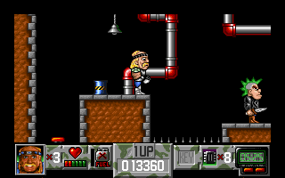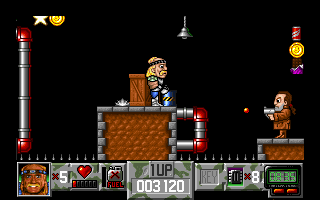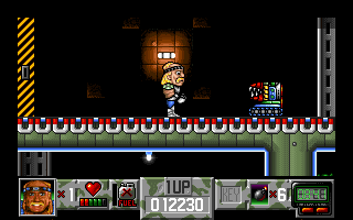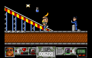 The DOS version also has this strange stylistic choice where the bosses have more or less realistic human proportions, while Hogan and every other enemy in the game is. All in all, however, the graphics are nice and colorful in that 90s platform game sort of way, more so in the Amiga version with its pretty colored backgrounds rendered by the power of the “Copper”, while the DOS backgrounds are mostly black. It should be noted that every version, including the C64 one, has quite fluid scrolling. The BGMs range from “somewhat catchy” to “annoying”.