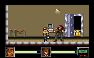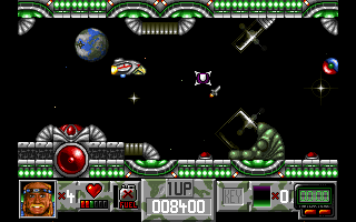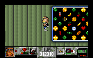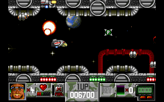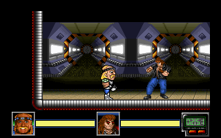 When a level is completed, our hero has to face a boss. In the Amiga version, they are some sci-fi guys invented for the game, another guy who is probably one of the bounty hunters pursuing Shep, and big bad Suitor himself with his reptilian final form. In the DOS version the first two are replaced by two random palette-swapped thugs, and every one of them has the same picture near their lifebar, even Suitor. This goes on to show how much they really cared. The boss battles are made to look like a fighting game, but actually it’s just another platformer section, since they control exactly the same, with the same moves mentioned before and no further complexity than “avoid the enemy and punch/kick him until he dies”. They are most likely an afterthought and as such they are boring and forgettable, even the final battle against the big bad. At least the initial shooter segment, while still bland, was somewhat competent and fun. Until the tons of power-ups make it laughably easy, that is.