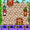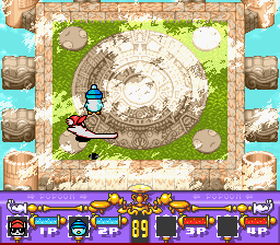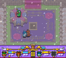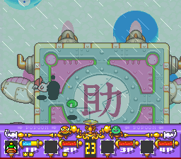 The arenas are square-shaped, seen from a top-down view, and feature a few environmental hazards as well as the intervention of a couple enemies from Ufouria every now and then, which will either hinder or help by dropping some items. Every character can use up to two of his/her usual special moves, for the first time directly against their friends – just why they always have to fight each other is never explained. The arenas represent the usual places featured in all previous games, such as O-Chan’s mansion, Bobo’s nest, Utsu’s base/planetoid, and so on.