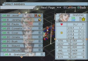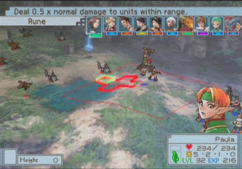 The gameplay of Suikoden Tactics borrows several elements from other SRPGs. It’s essentially an amalgam of Fire Emblem, Vandal Hearts and Final Fantasy Tactics, with bits of Suikoden flavor sprinkled in. Like in Fire Emblem, characters can trigger conversation with one another by standing next to each other. If two characters have a strong relationship, they can perform unite attacks or establish mutual effects. If the characters are not significantly involved with the plot, they are marked with permadeath status, so once they die in battle, they may die for good. This can be frustrating, but fortunately there are ways to prevent permadeath.
