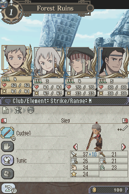 The regular battles are similar to Suikoden IV, with four people in the party. However, weapon range still plays a role in combat. Short ranged weapons such as swords stay in the front while long range weapons such as the bow and arrow stay in the back.
