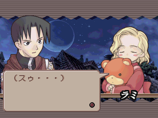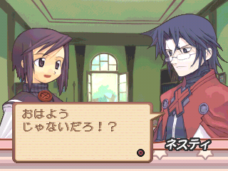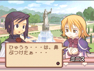 The first Summon Night begins in the real world of "Nippon" (ha ha). You can select one of four main characters, all high school students with fears of an uncertain future. All of a sudden, they hear a voice begging for help, and all of a sudden, they find themselves transported to the alternate dimension of Rinbaum. From there, they're rescued by a group known as the Flat Gang, who take them in and discover their role in this strange world.