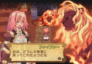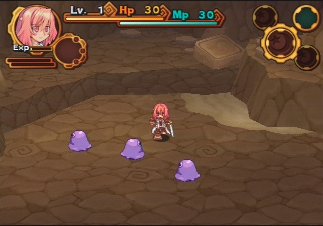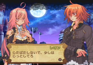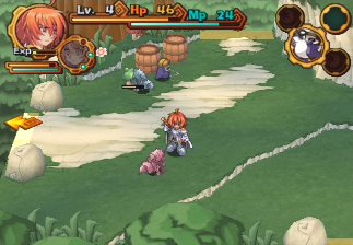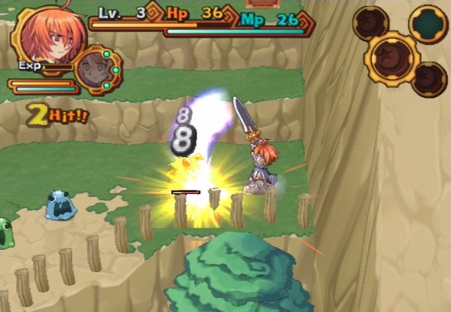 The graphics seem to use the same engine as Summon Night 3. In still shots, it looks pretty decent - the backgrounds have a colorful, artistic feel, and the high resolution sprites look fantastic. This is, until you see them move, as everything is quite poorly animated. Each area is broken up unto small chunks, which hover over a static background wallpaper. All of this looked fine in a strategy RPG, but it looks cheap as an action game. And furthermore, even the action isn't done right, as fighting is extremely clumsy and unresponsive. It's not as bad as the Taito's Ys remakes for the PS2, but it reeks of a game that was just kinda thrown together.
