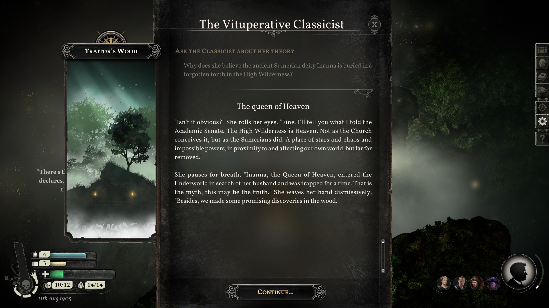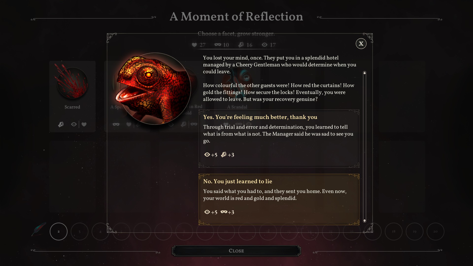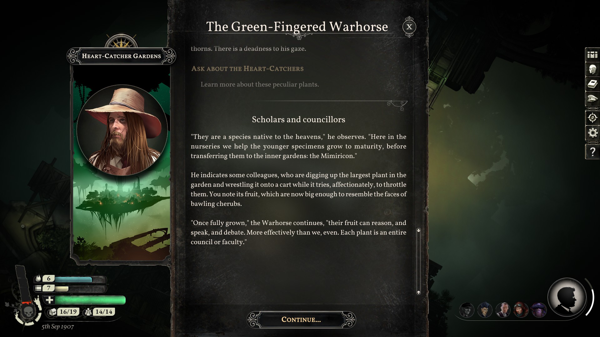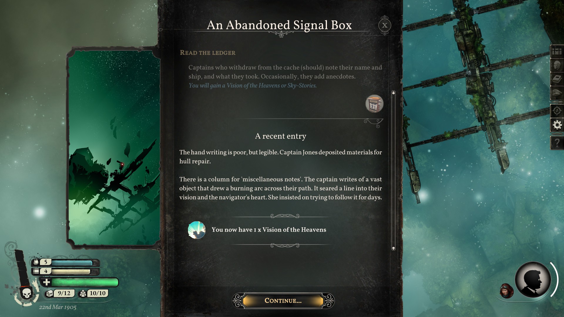 The roguelike elements from Sunless Sea are mostly underemphasized. ‘Merciful Mode’ in which the game autosaves at ports is now featured prominently, there’s no real need to grind up the stats across multiple playthroughs and when continuing a dead captain’s legacy, progress of some of the quests is kept and a map of discovered locations is carried over (without the experience point penalty that came with it in the previous game). It would be completely possible to remove permadeath, random generation and legacy system without harming the game (with an exception of needing to redesign an early part of a quest for the game’s hidden ending), but their inclusion is inoffensive and easy to ignore.