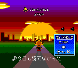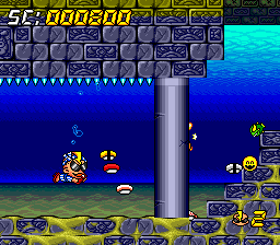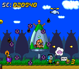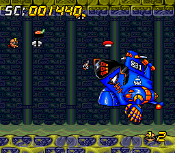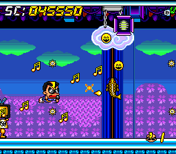 In Super Air Zonk, there are four levels to choose from in the beginning – Sea, River, Factory, and TV – while the final set of levels sends Zonk off into outer space. There’s no longer a staple of companions to choose from. Instead, midlevel, you’ll find a little creature being chased by an enemy with a net. Save it, and it’ll join your side. You can merge with it immediately, much like the similar forms from Air Zonk. You can also separate from it, after which it’ll fly around the screen for a bit doing some damage, before flying back next to Zonk to act as an Option. It’s a little more versatile than the first game in this respect. Plus, you keep the transformation even after you get hit. Some of the transformations are pretty cool, too – in one stage, you turn into a sushi chef and throw bits of raw fish across the screen, and in another, you morph into a singer, who attacks with swirling musical notes. But overall neither the companions nor their weapons are quite as silly as the first game.