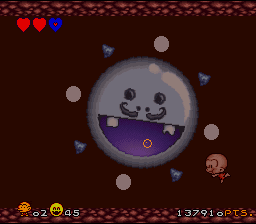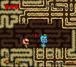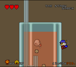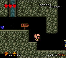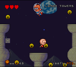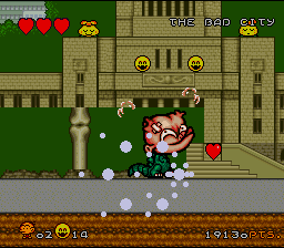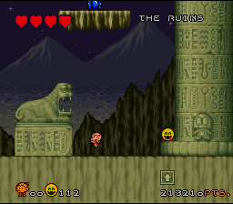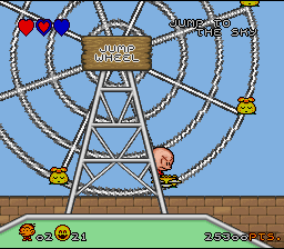 There are still plenty of completely random stages – you start off in what appears to be modern Japan and go through an amusement park. One stage consists of several areas where you go through a dinosaurs body, including the circulatory system, the intestines, and the heart. (Strangely, the boss of this level is named Blue Balls, undoubtedly a result of naive Japanese developers trying to speak English.) There is one stage that takes place on the Moon in low gravity, although it’s quite hard to control Bonk in these levels.