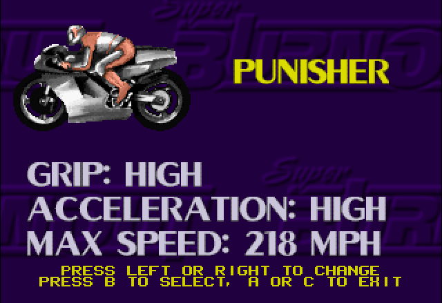 So what does the game offer in terms of content? There are four selectable game modes, all of which correlate as to what they are in their names: Trainer, Versus, Championship and Record. Trainer is your run-of-the-mill training mode where players can get the hang of the controls, practice with any of the selectable bikes and get the feel of how each one reacts. There are seven to choose at the beginning, plus an unlockable eight bike that can only be obtained by getting the A rank on Championship mode, or by punching a cheat code at the title screen.