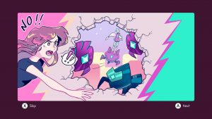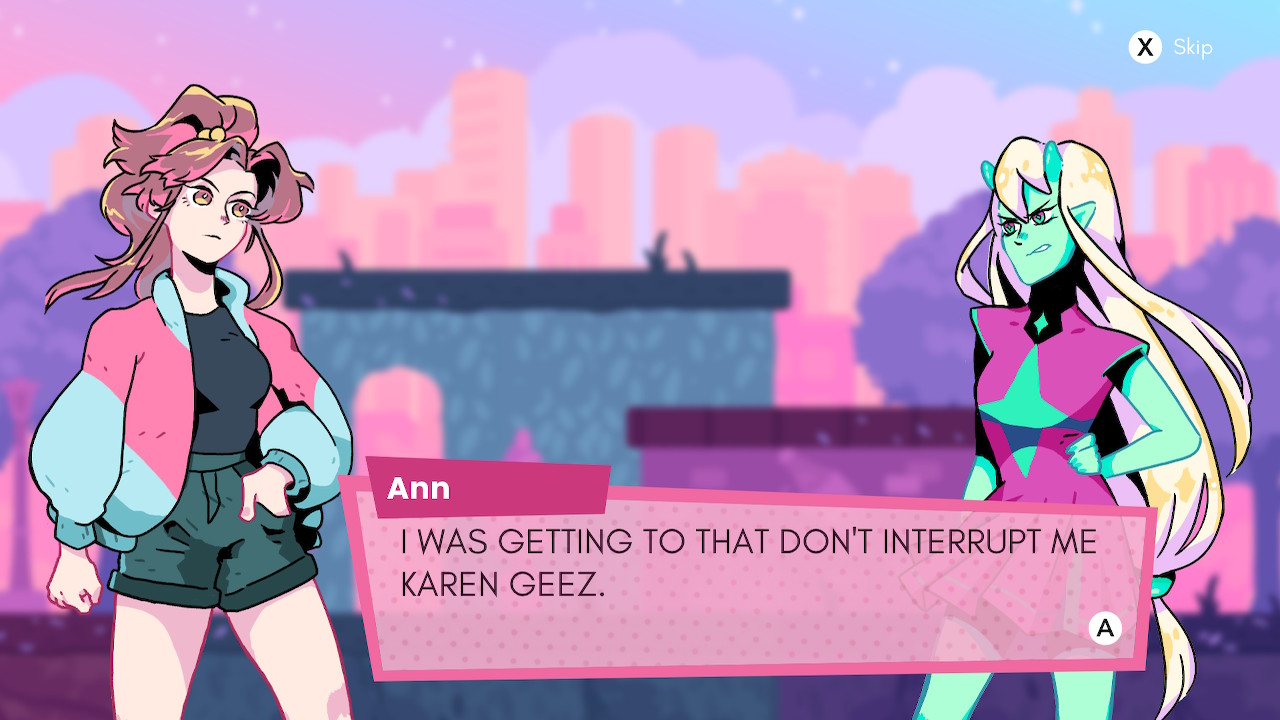 The protagonist, Karen, has a standard punch that can be used unlimited times, a homing kick that can be used to knock enemies back, a gun which targets the nearest enemy it’s pointed at and does very little damage before being recharged, and a powerful charged beam that hits everything in a straight line, and can only be used once a meter slowly fills up. The button used to perform the homing kick can also be used to slam the ground or do a roll along the ground which also doubles as an attack.